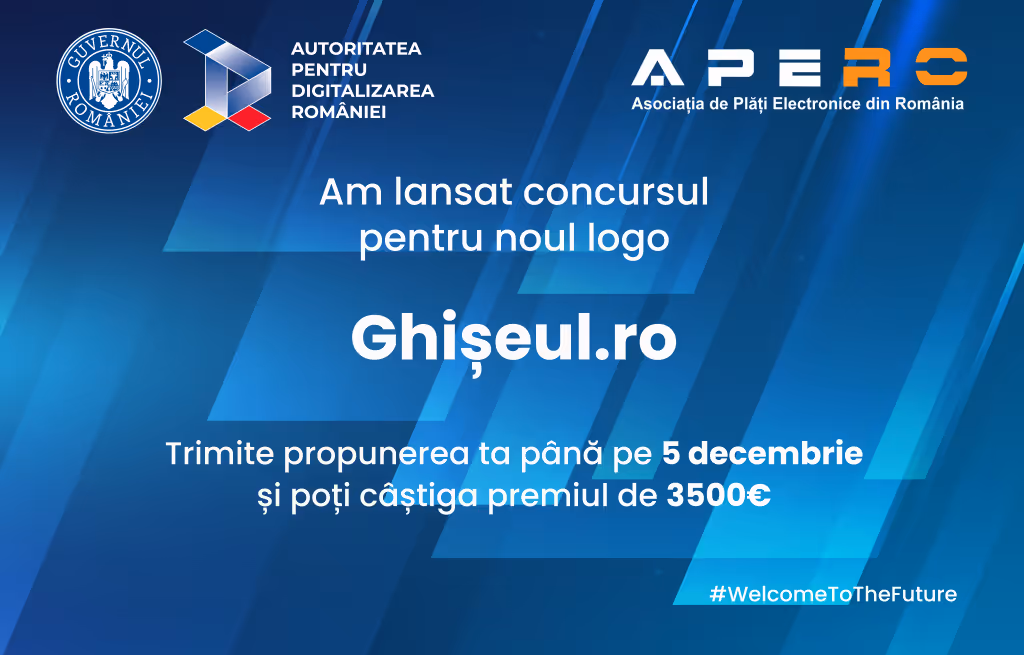 Autoritatea pentru Digitalizarea României (ADR) lansează astăzi, 15 noiembrie, concursul pentru realizarea noului logo al platformei oficiale de plăți online a statului român – Ghișeul.ro. Concursul se va desfășura în perioada 15 noiembrie – 15 decembrie 2021. Propunerea grafică declarată câștigătoare de către juriul concursului va fi premiată cu 3500 de euro, fonduri oferite de Asociația de Plăți Electronice din România (APERO).